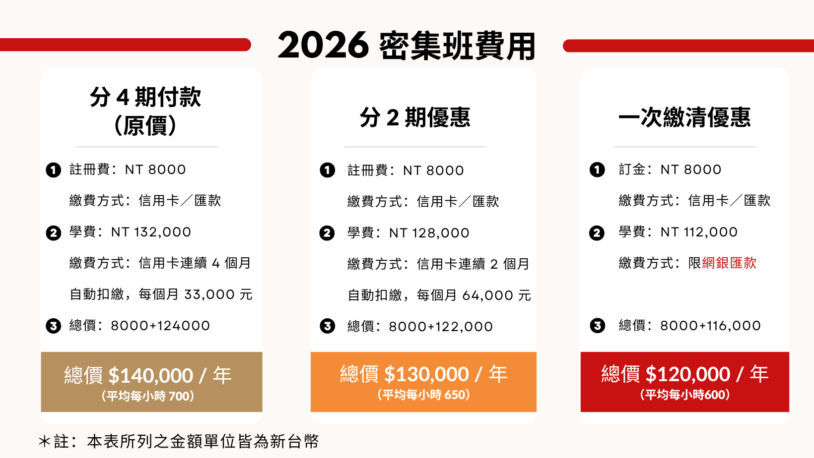 【0-B1 一年抵四年200小時密集班】【同步線上】: 2026年(已開放付訂金預約名額)
