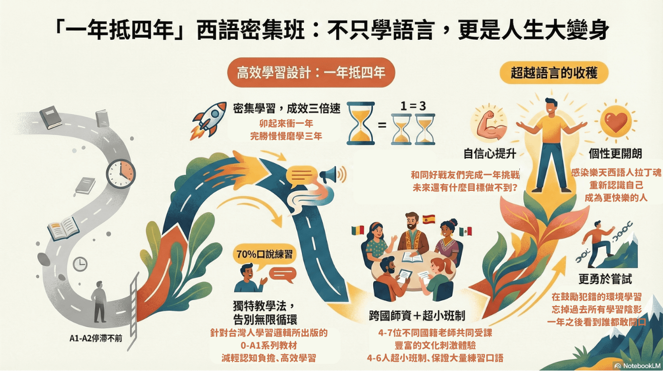 一年期密集班的設計,就是希望您可以一年一氣呵成,不中斷高效將 0-B1 的進度學完,節省您的時間成本,盡快將西班牙語能力提升到一個程度。