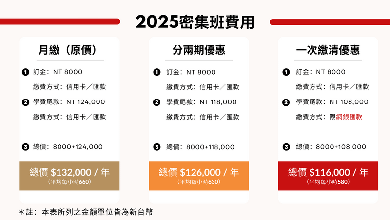 各密集班皆為 200 小時線上同步課程,以下所列時間皆為台灣時間 (GMT+8)。